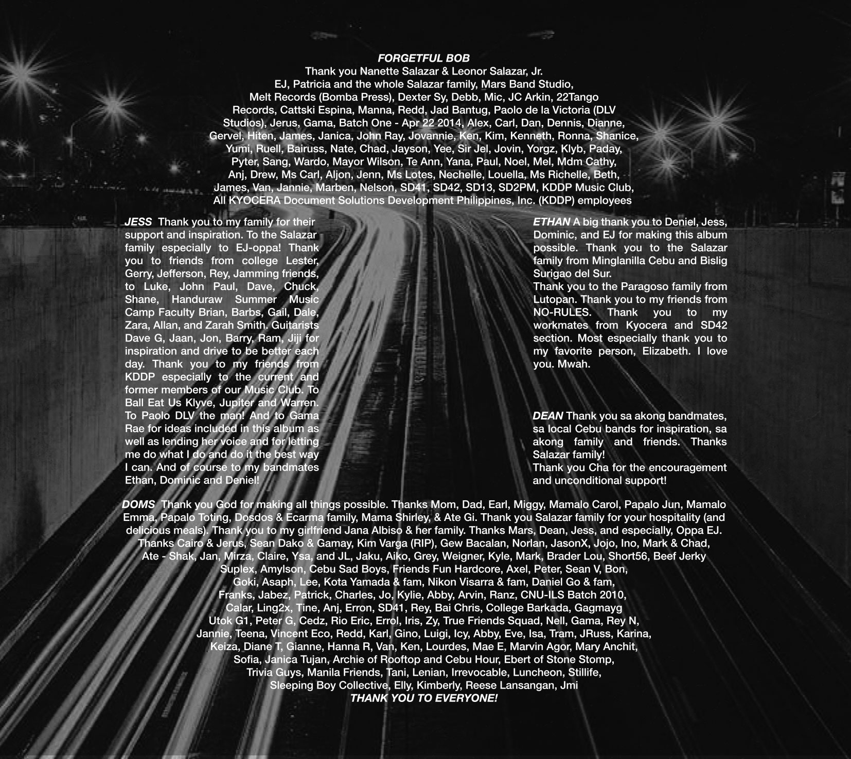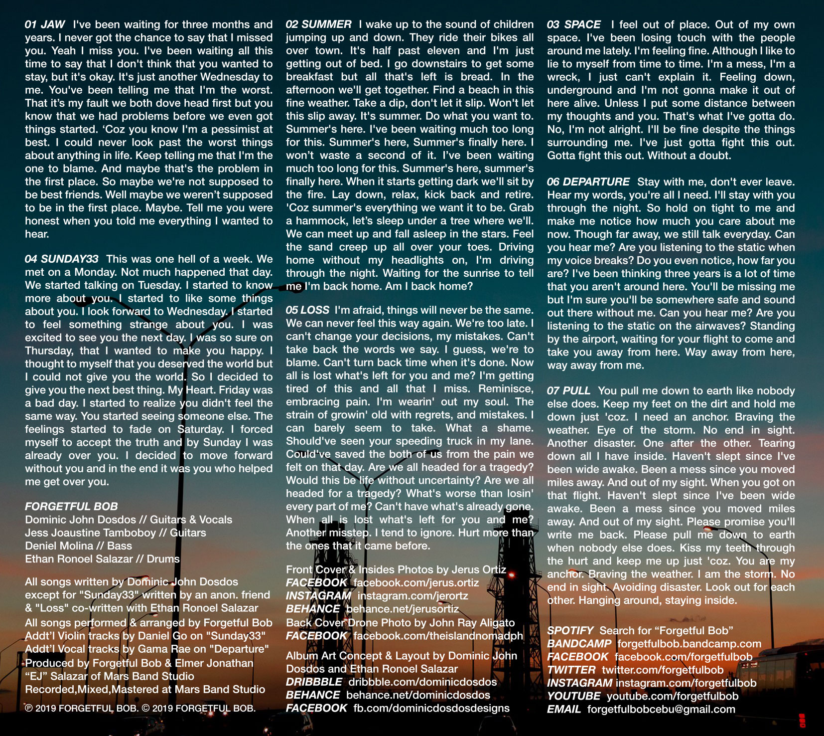 1 FORGETFUL BOBI thought you were arriving so much later. I should've picked you up from the airport but I guess that I forgot again. I'm hopeless, I'm sorry for this lack of memory. I'm hoping you'd find it in you to forgive me. I thought our anniversary was in August. I thought your birthday wasn't until next week. But I guess that it's today but I forgot to get you that book you wanted. Man I really messed up. All the things I forget I keep track of. All the things I remember I just forget. All the things I forget I keep track of. But now I can't seem to find you. Find you.Dominic John Dosdos – Guitar, Vocals Recorded, Mixed, and Mastered by Elmer Jonathan "EJ" Salazar at Mars Band Studio Writer(s): Dominic John Dosdos